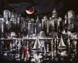 Night is an colorful image of a nightscape including buildings and moon. Enjoy its beauty and color reproduced as a fine canvas print. Justyna Kopania is from Warszawa, Poland. In her words when she paints she tries to show the 'world', which could be seen by looking at reality that surrounds us, from another perspective, unusual, remote, sometimes through the eyes of the child, sometimes music, composer, or someone who looks lichen on the sea, the moon , the sky and the stars ..., the river ... looks out the window and looks out into the street. Walking down the street looking at people's faces. In rain, snow or fog. Perhaps the world that surrounds us really is quite different than we perceive it every day.